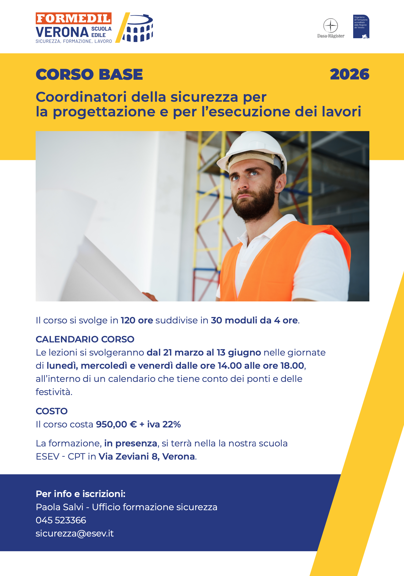 Il costo del corso base coordinatori alla sicurezza è di € 950,00 +iva 22%